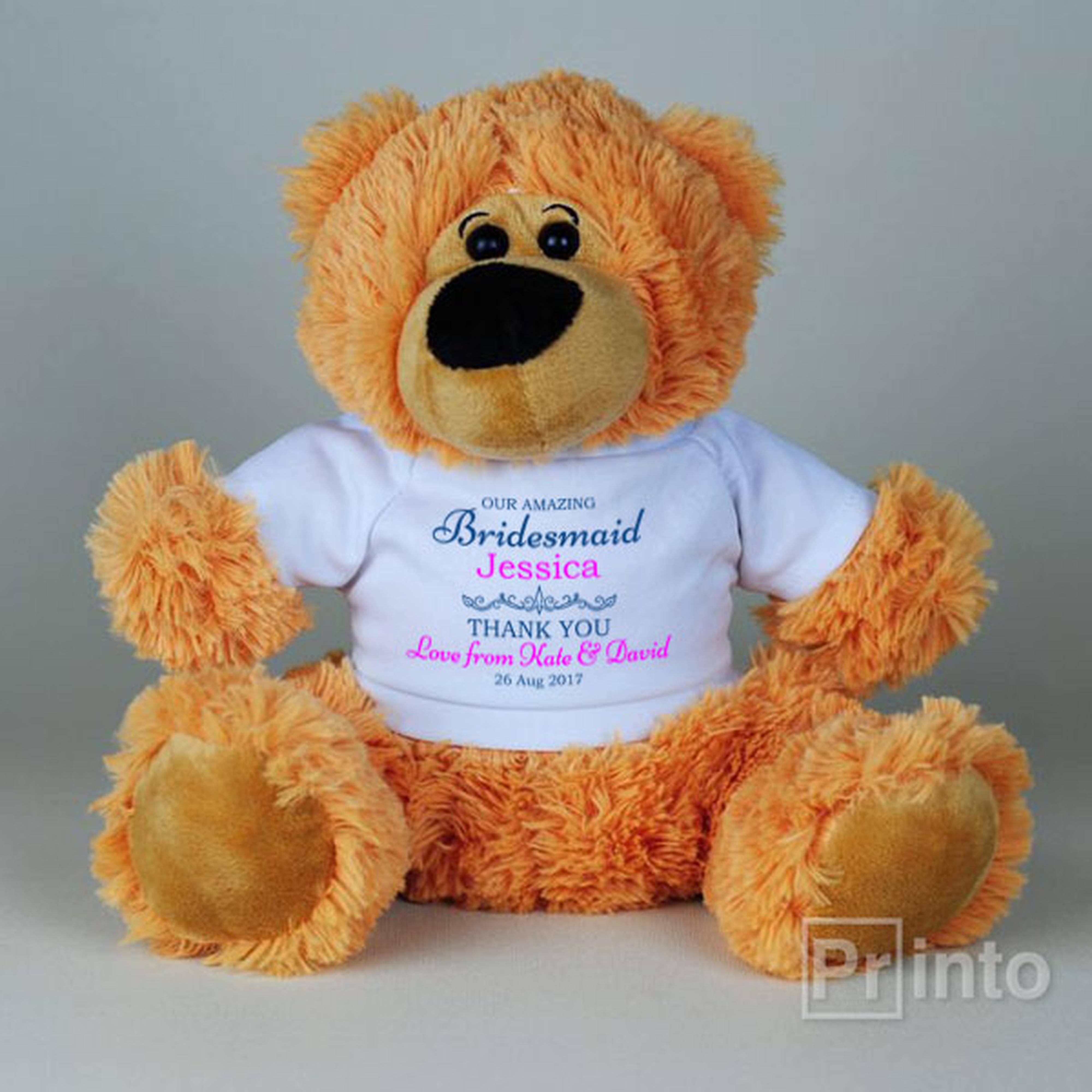 Please meet TED. This is adorable, fluffy and super soft Teddy bear. These bears are made to the highest standards and will last for generations to come. He is wearing a white polyester T-shirt with text printed on front using Eco-friendly patented ink. Makes unforgettable gift for any occasion. This WeddingTed is a perfect gift for your wedding ceremony.