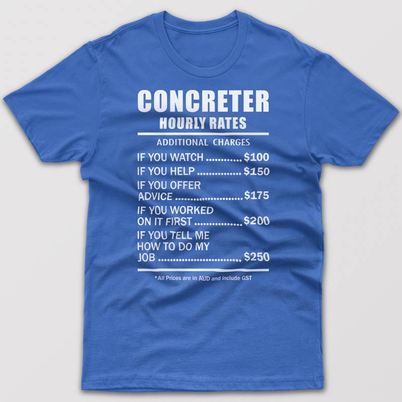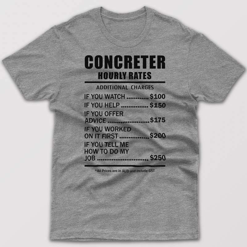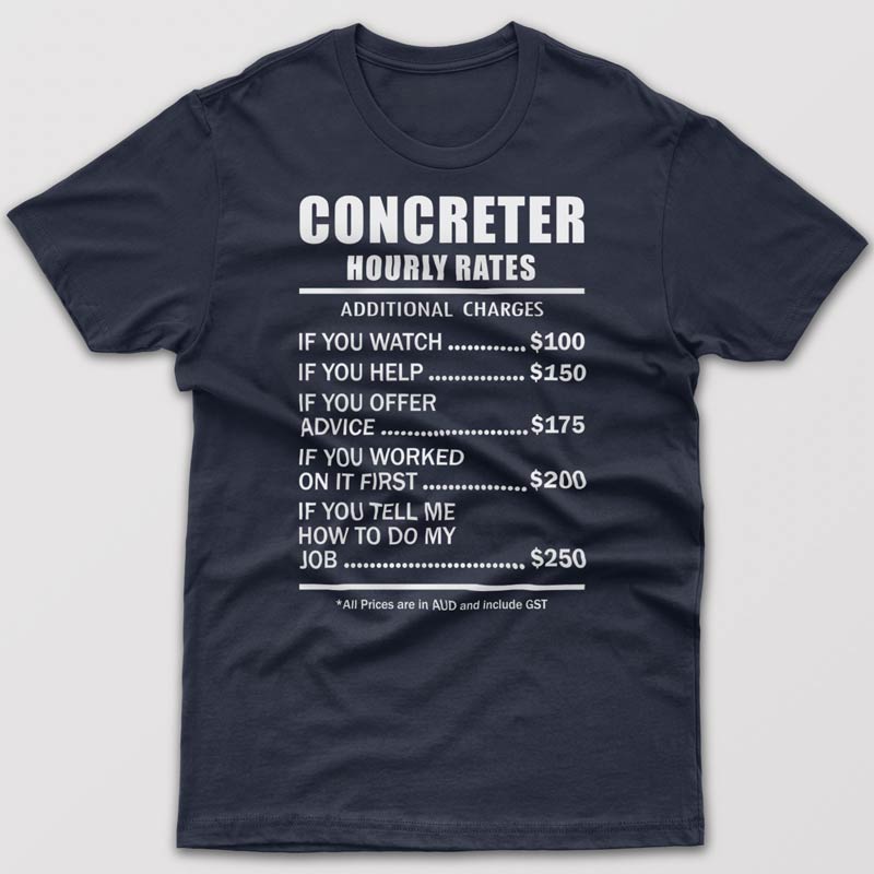 As a Concreter how do you deal with difficult customers? Business trainers suggest to try the following: grow thick skin, always try to keep calm, resolve the customer’s problem as soon as possible, talk to them about what you can and can’t do or simply compensate for their discomfort. Here at Printo we can offer you a simple and hilarious solution. Wearing this cool T-shirt with ridiculous hourly rates might change your customer’s behavior. As we all know “Laughter is the best medicine”.