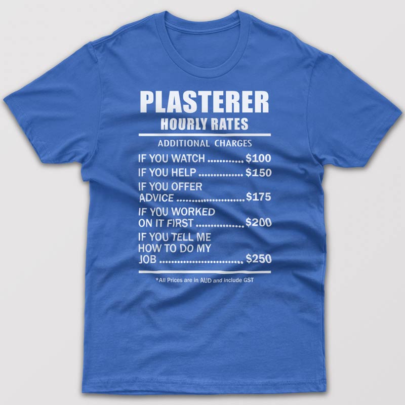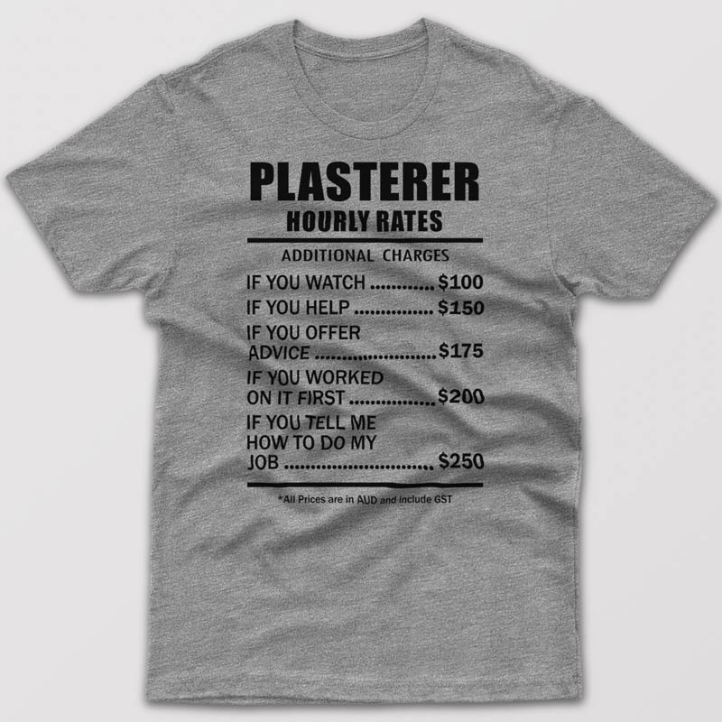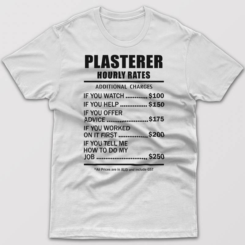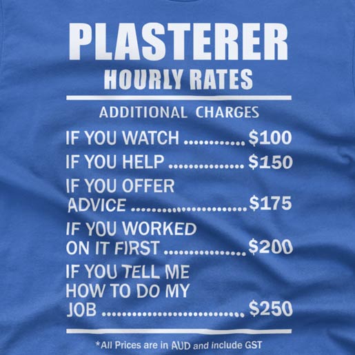 As a Plasterer how do you deal with difficult customers? Business trainers suggest to try the following: grow thick skin, always try to keep calm, resolve the customer’s problem as soon as possible, talk to them about what you can and can’t do or simply compensate for their discomfort. Here at Printo we can offer you a simple and hilarious solution. Wearing this cool T-shirt with ridiculous hourly rates might change your customer’s behavior. As we all know “Laughter is the best medicine”.