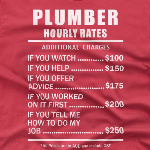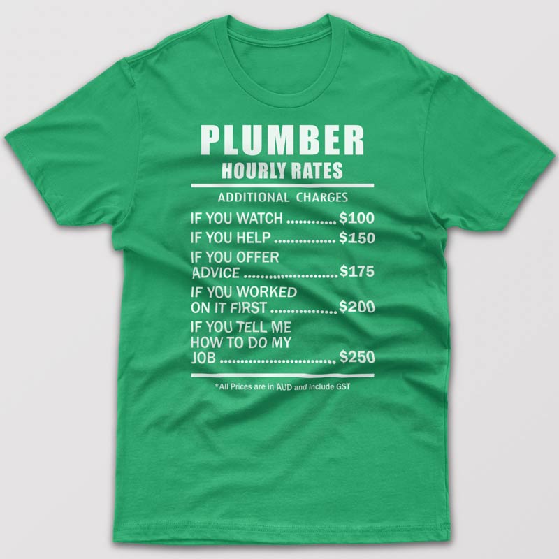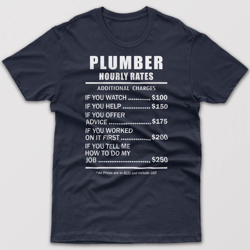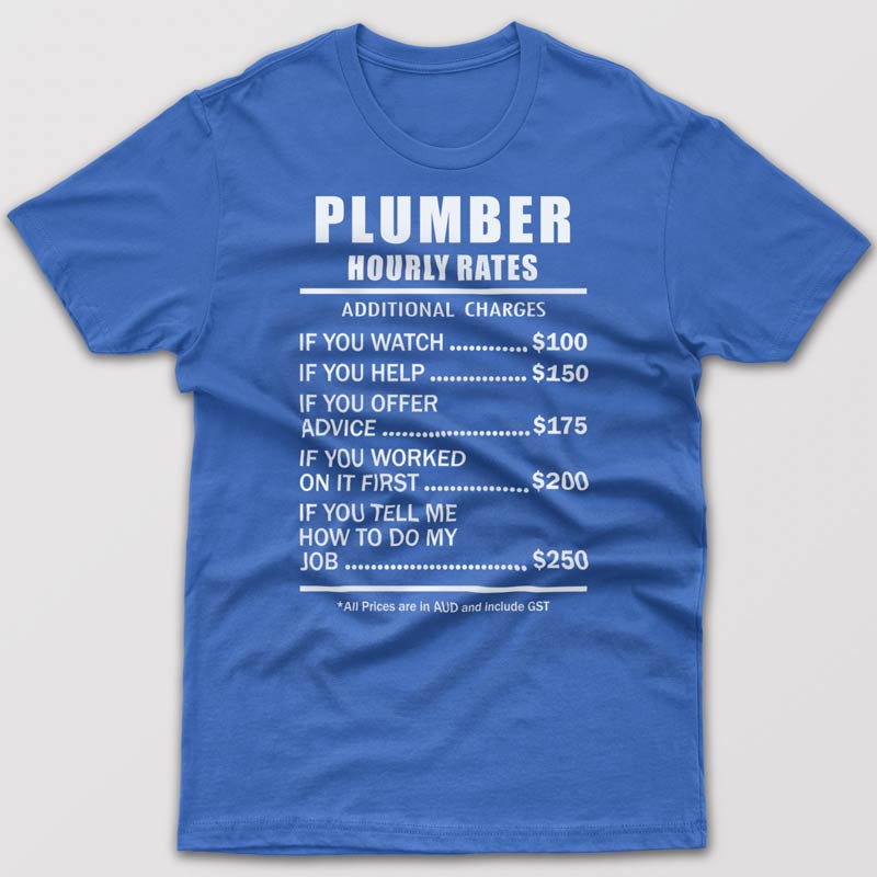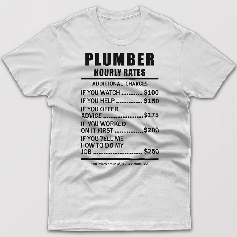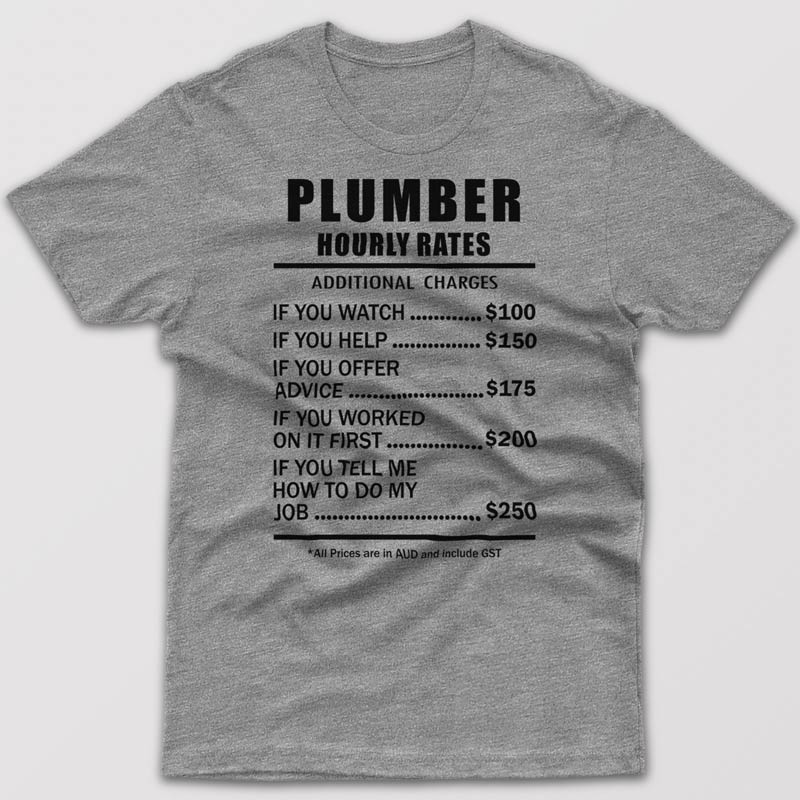 As a Plumber how do you deal with difficult customers? Business trainers suggest to try the following: grow thick skin, always try to keep calm, resolve the customer’s problem as soon as possible, talk to them about what you can and can’t do or simply compensate for their discomfort. Here at Printo we can offer you a simple and hilarious solution. Wearing this cool T-shirt with ridiculous hourly rates might change your customer’s behavior. As we all know “Laughter is the best medicine”.